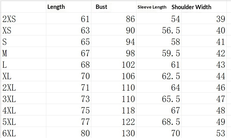 Sizes: XS, S, M, L, XL, 2XL, 3XL, 4XL, 5XL